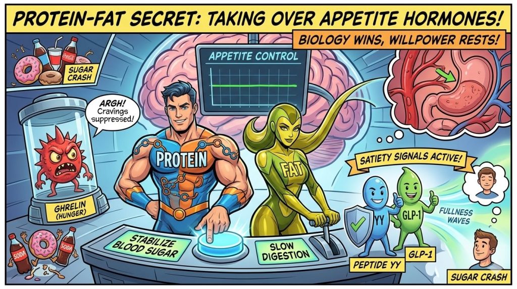 Protein and fat stop sugar cravings. Here’s how — Protein and fats digest more slowly than simple carbohydrates, which changes how your body processes food. When these nutrients form the foundation of a meal, they slow gastric emptying and allow glucose to enter the bloodstream gradually rather than all at once.